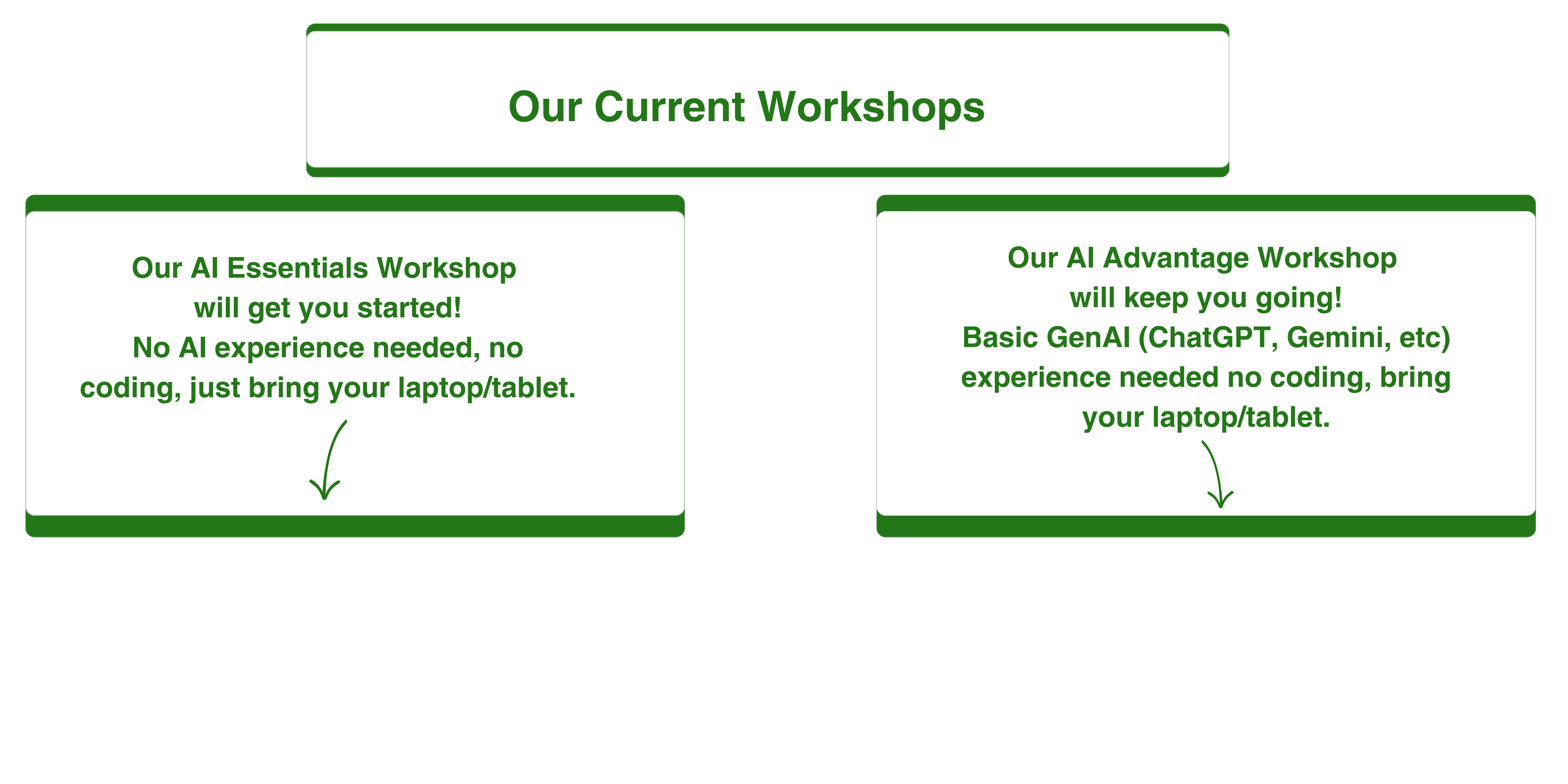 Arlington, MA - NEW! AI Advantage Workshop! Spring 2026 Registration OPEN Arlington, MA - NEW! AI Advantage Workshop! Spring 2026 Registration OPEN Arlington, MA - AI Essentials Workshop! Spring 2026 Registration OPEN (almost full!) Arlington, MA - AI Essentials Workshop! Spring 2026 Registration OPEN (almost full!) Needham, MA - AI Essential Workshop! Fall 2026 Registration OPEN SOON Needham, MA - AI Essential Workshop! Fall 2026 Registration OPEN SOON Want To Bring Our AI Workshops to Your Workplace? Click Here. Want To Bring Our AI Workshops to Your Workplace? Click Here. Lexington, MA - NEW! AI Advantage Workshop! Spring 2026 Registration FULL Lexington, MA - NEW! AI Advantage Workshop! Spring 2026 Registration FULL We’ve partnered with Virtual Badge to provide digital credentials that let you validate and showcase your AI fluency to the world. Questions? Email Us Here. We Love to Chat. Questions? Email Us Here. We Love to Chat.