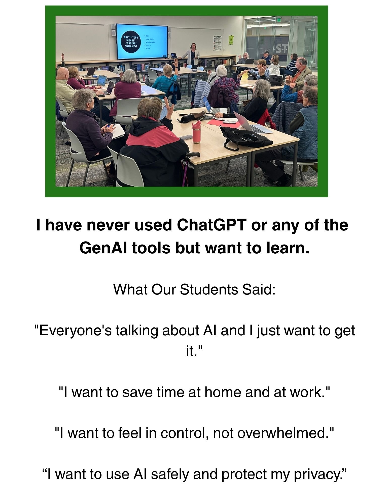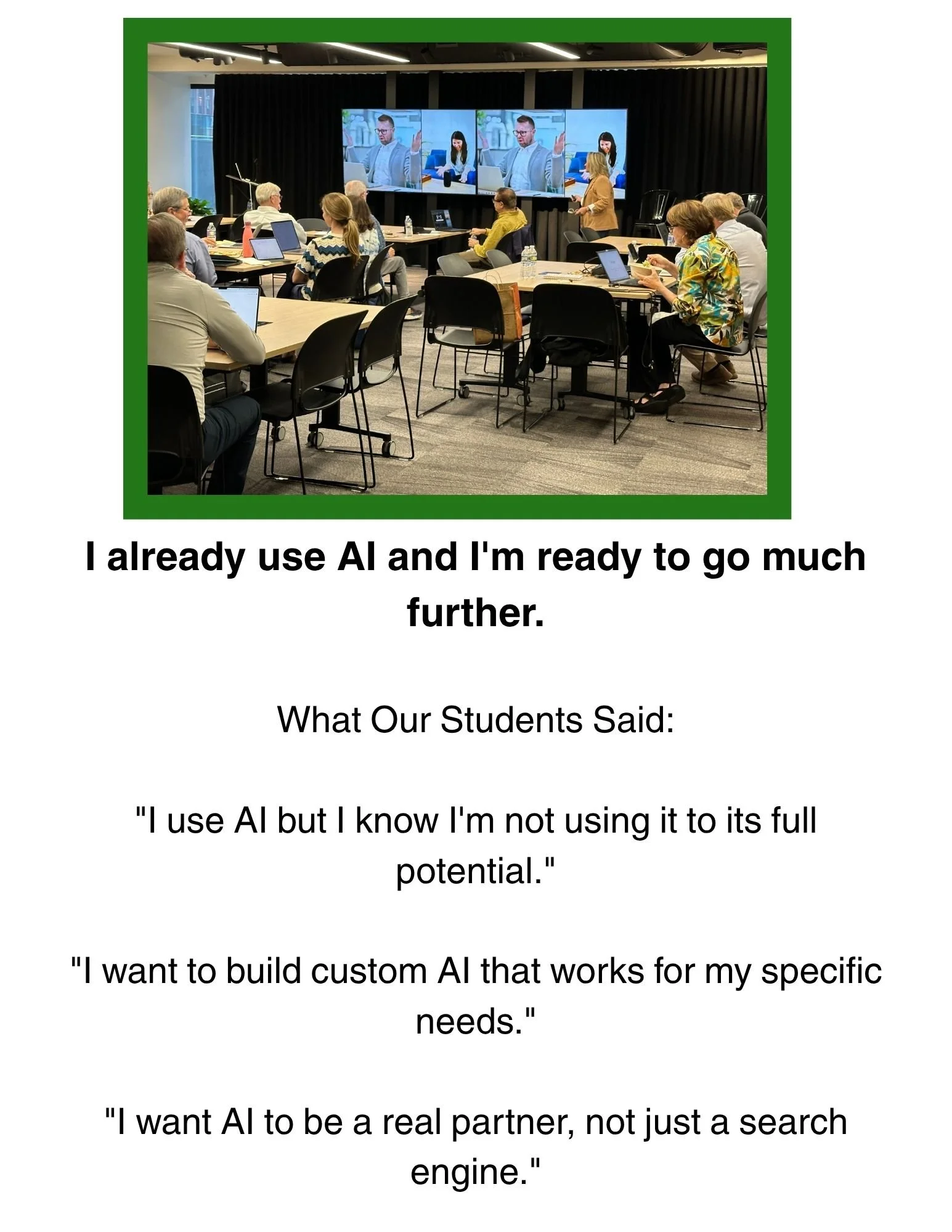 Not Sure Which Workshop is Right For You? Our Students Can Tell You. Learn more about AI Essentials Workshops >> Learn more about AI Advantage Workshops >> Learn more about Custom AI Workshops >>